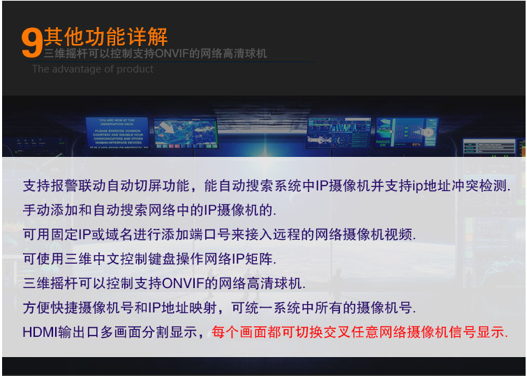 2 高清HDMI输出口多画面分割显示,每个画面都可切换全交叉任意网络摄像机信号显示