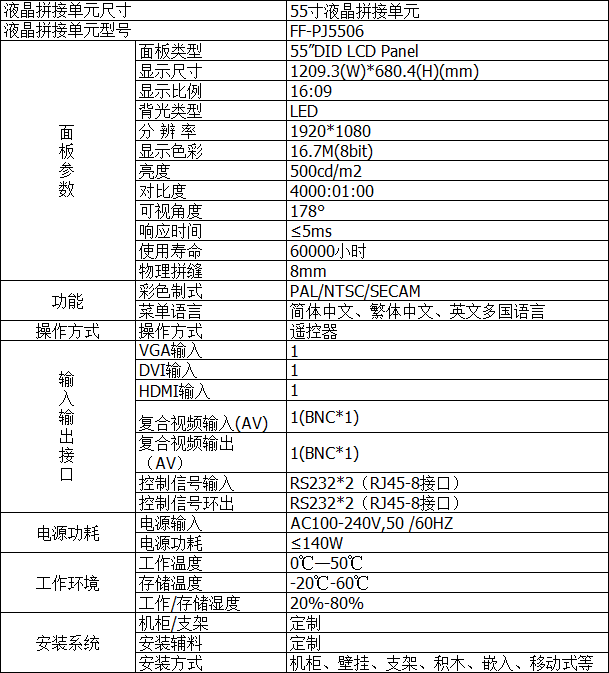 非凡专显55寸液晶拼接屏采用LG—IPS硬屏技术工业级液晶显示面板,结合非凡专显超窄边拼接技术、信号切换技术、无损远程传输技术、图像拼接处理技术等综合应用组成一套功能多样化、控制智能化、操作先进化的液晶拼接显示系统,为客户展现出高亮度、高清晰度、无干扰的优质液晶拼接画面。专业的防灼屏及散热技术,平均无故障运行时间(MTBF)达60000小时。完美的无缝拼接效果,能够最大程度地减少观看者的视觉盲点与视觉割裂感,为您呈现浑然一体的恢弘视野和超清晰震撼的动态视觉体验。
